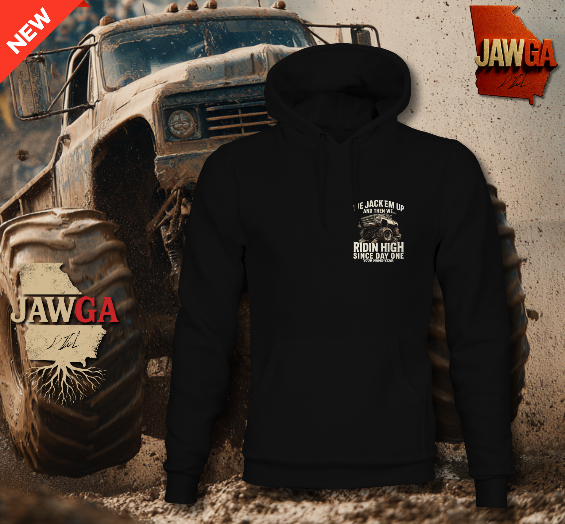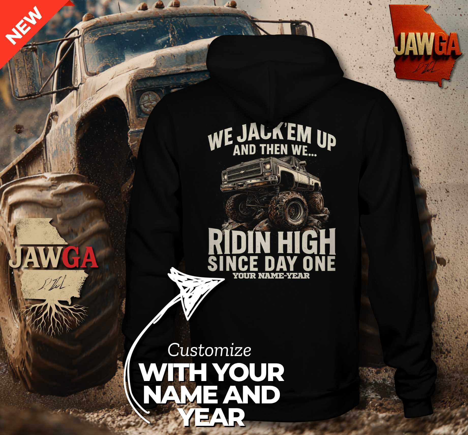 Show off your country roots and lifted truck pride with this bold Jawga Originals hoodie built for everyday wear. Featuring a rugged truck graphic and the iconic “Ridin’ High Since Day One” theme, you can even personalize it with your name and year to make it truly yours. Soft, durable, and made to handle mud, chill, or the open road, this is the hoodie that never quits.Specifications