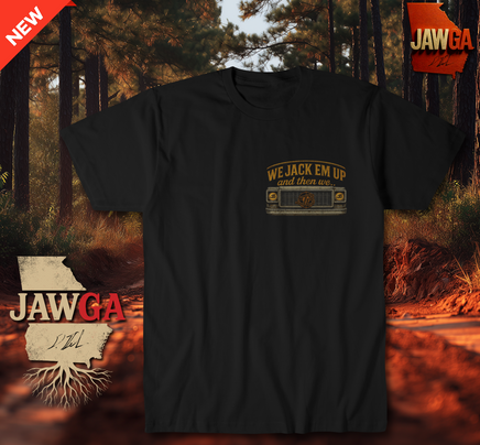 Turn up the backroad attitude with the Jawga We Jack Em Up T-Shirt. Featuring bold lettering over a vintage truck grille with the JB emblem in rustic detail, this tee captures the spirit of lifted trucks, Southern pride, and country living. Built for comfort and durability, it’s the perfect shirt for mudding, tailgates, and late-night bonfires.