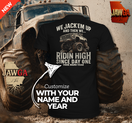 The Jawga Ridin High Custom Ladies T-Shirt lets you make it personal while repping true southern roots. Featuring the bold slogan “We Jack’em Up and Then We... Ridin High Since Day One,” this shirt celebrates lifted truck life and Jawga heritage with attitude. Each shirt can be customized with your name and the year you started listening to the Jawga Boyz, printed right on the design. Built on the premium Gildan 64000L for comfort, style, and durability—it’s made for country girls who ride high and live proud.