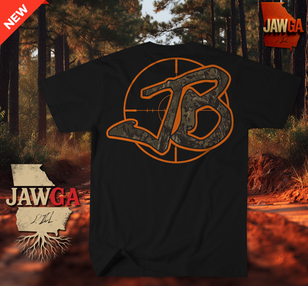 The JAWGA Boyz “Throwback JB classic Logo” T Shirt is built for fans who have been here with us from the beginning. Featuring the Throwback JB Classic logo outlined in hunter orange with a camouflage fill and crosshair target detail this design blends country grit with Georgia roots. Printed on a premium cotton blend for comfort and durability it is perfect for everyday wear or nights around the bonfire.
