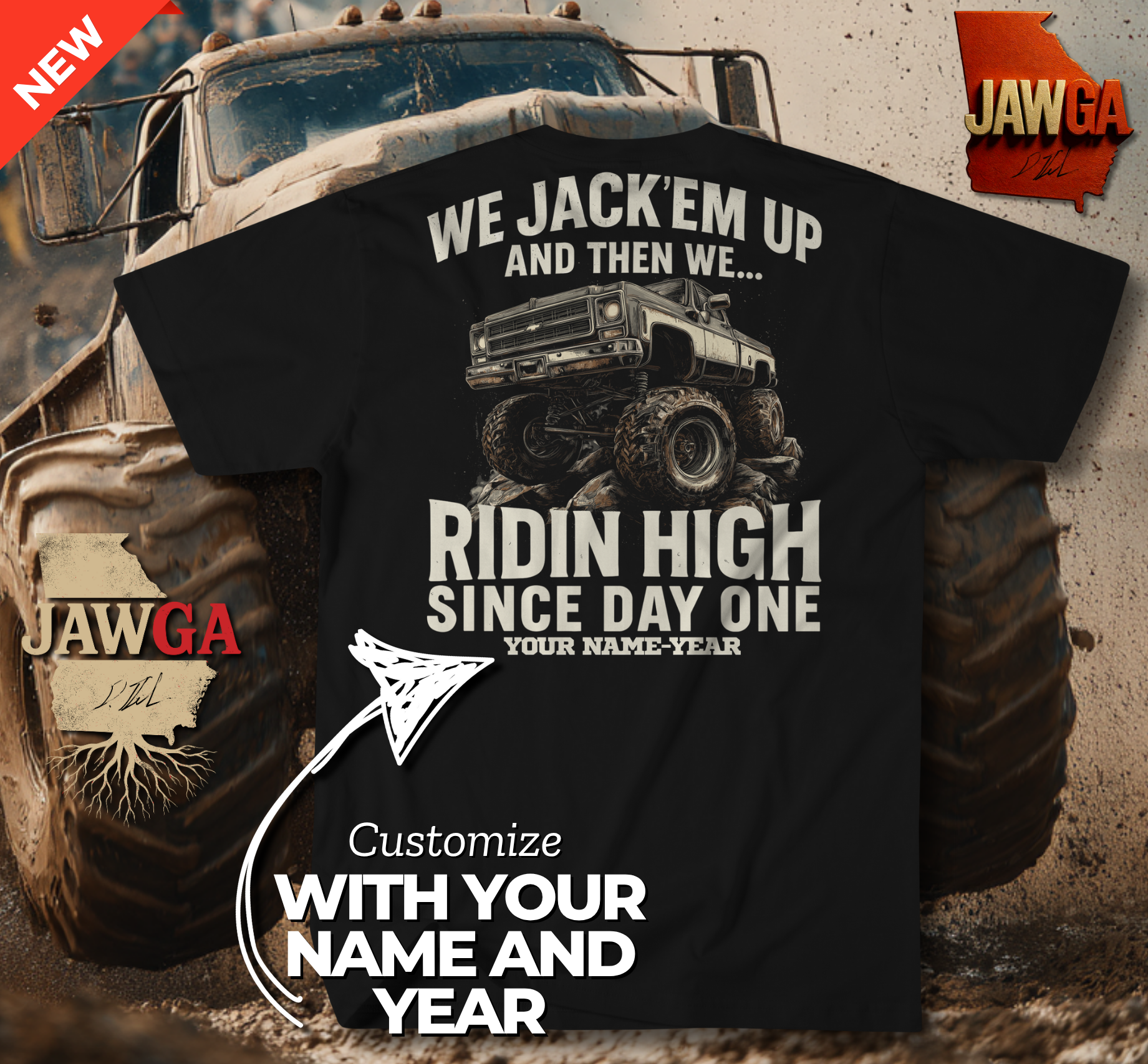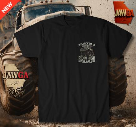 The Jawga Ridin High Custom Giden 8000 T-Shirt lets you make it personal. Featuring the bold slogan “We Jack’em Up and Then We... Ridin High Since Day One,” this shirt celebrates southern pride, lifted trucks, and Jawga heritage. Each shirt can be fully customized with your name and the year you started listening to the Jawga Boyz, printed right on the design. Built on premium cotton with durable inks that can handle the mud and the miles, this one’s for the real fans who’ve been Ridin High since day one, their day one.